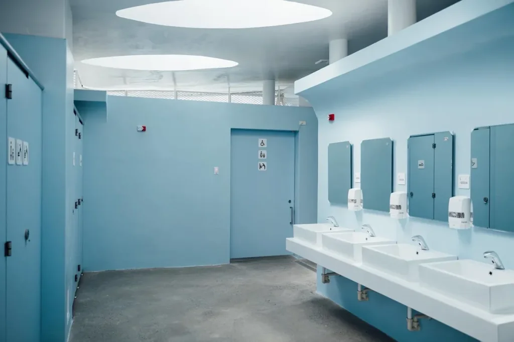 實際配置上,這次改造大幅調整男女廁比例,增加女性座位數量,也重新思考蹲式與坐式的比例(例如以 13:8 的配置回應不同習慣),更貼近實際使用情況。無障礙動線也同步優化,把過去設在地面的自動門軌道移到上方,讓輪椅使用者不再被軌道「絆一下」,出入變得平順很多。