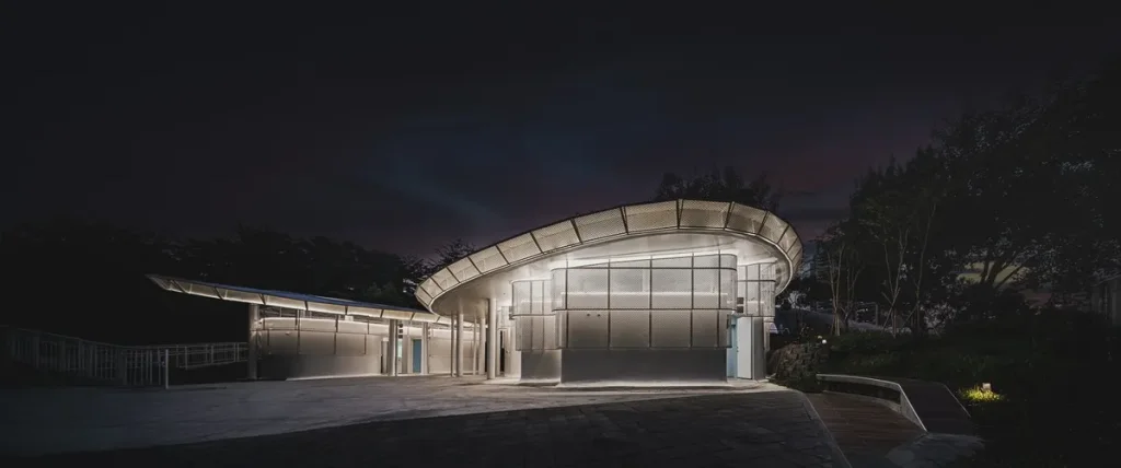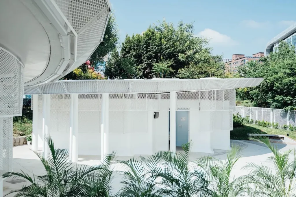 改造的第一步,是「把公廁打開」。設計團隊拆除了原本侷促的封閉外牆,用白色作為主色,搭配通透的擴張網立面。這樣一來,視線不再被厚重的牆體擋住,白天自然光可以穿透,夜晚則透出柔和光暈,讓建築在綠意間若隱若現,不再是被刻意藏起來的角落。