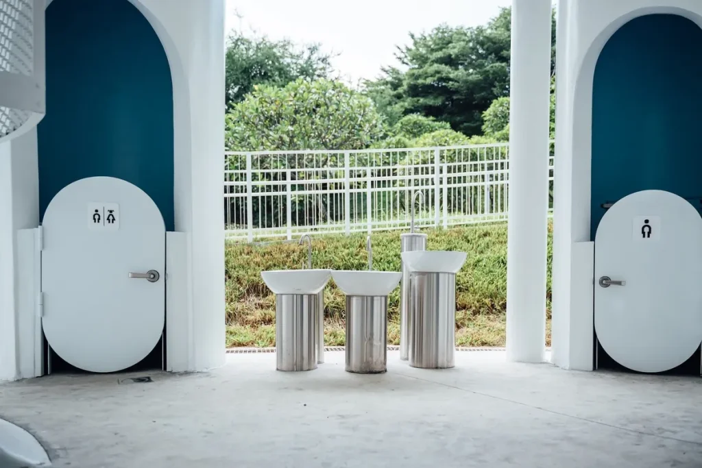 為了不讓改造只停留在「變乾淨、變新而已」,團隊特地飛到東京,實地走訪由安藤忠雄、隈研吾等多位建築師參與的 THE TOKYO TOILET 計畫。那裡的公廁像是散落在街道裡的藝術裝置:有透明變霧玻璃的廁所、像涼亭一樣的涼爽空間,也有專為兒童與多元使用者打造的廁間。