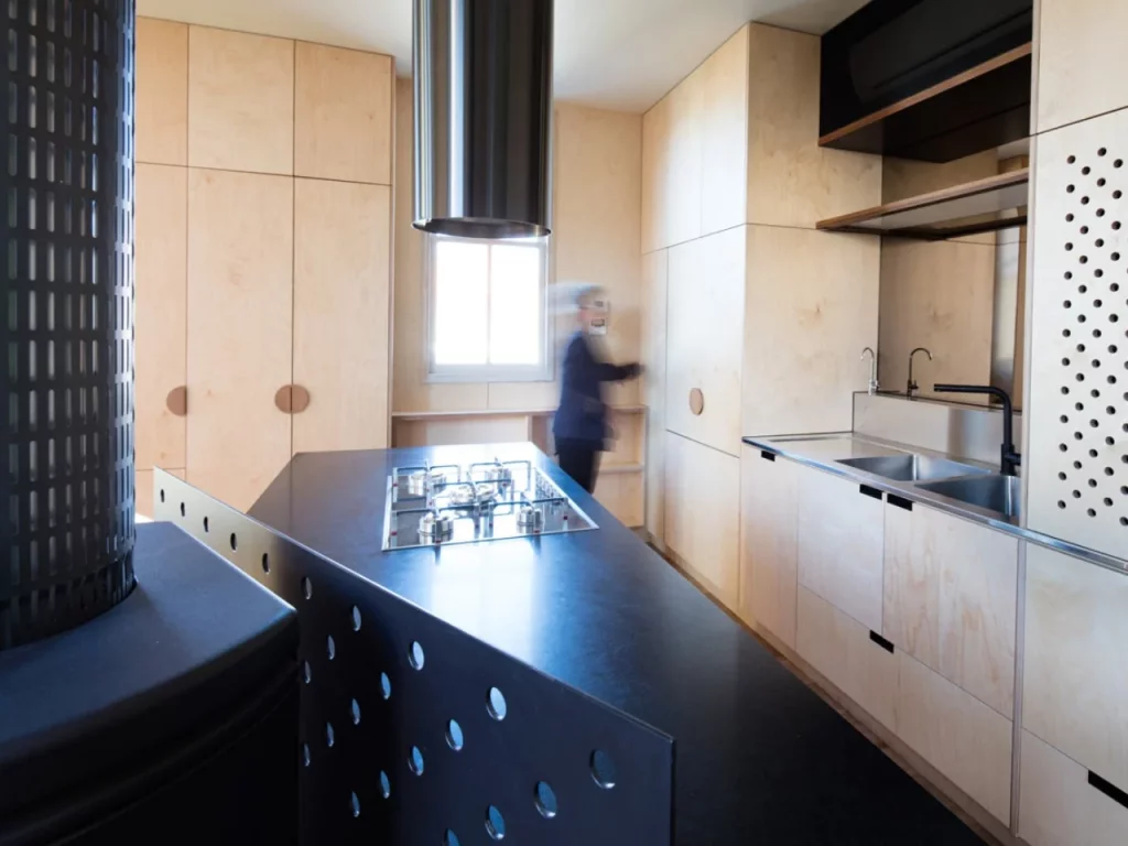 除了材料再利用,設計也積極導入被動式建築策略。例如運用切角形狀製造自然通風導流,增設天窗與高窗提升採光效率,大幅減少對機械冷暖設備的依賴。在有限的面積中,這棟三角住宅不僅找回一種空間效率,也體現了都市永續生活的可行路徑。