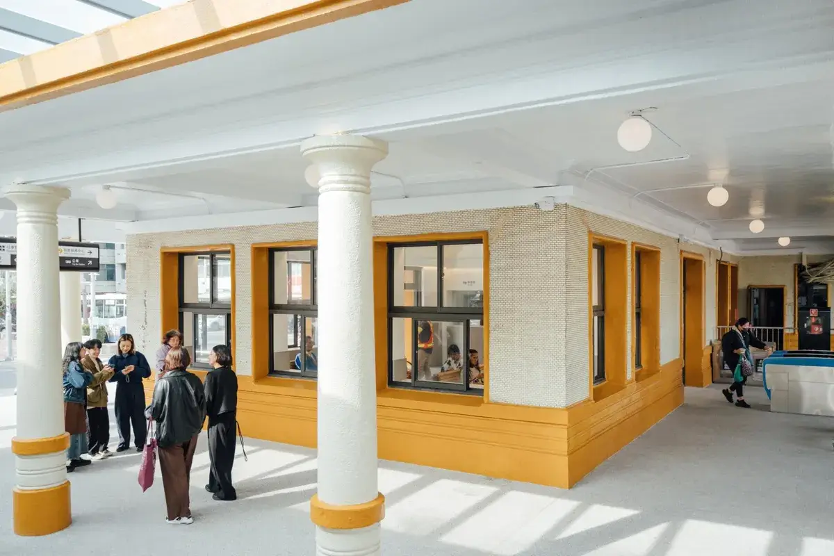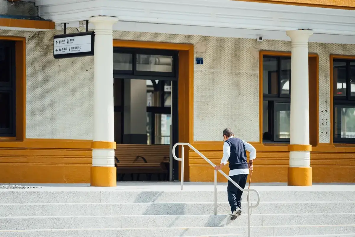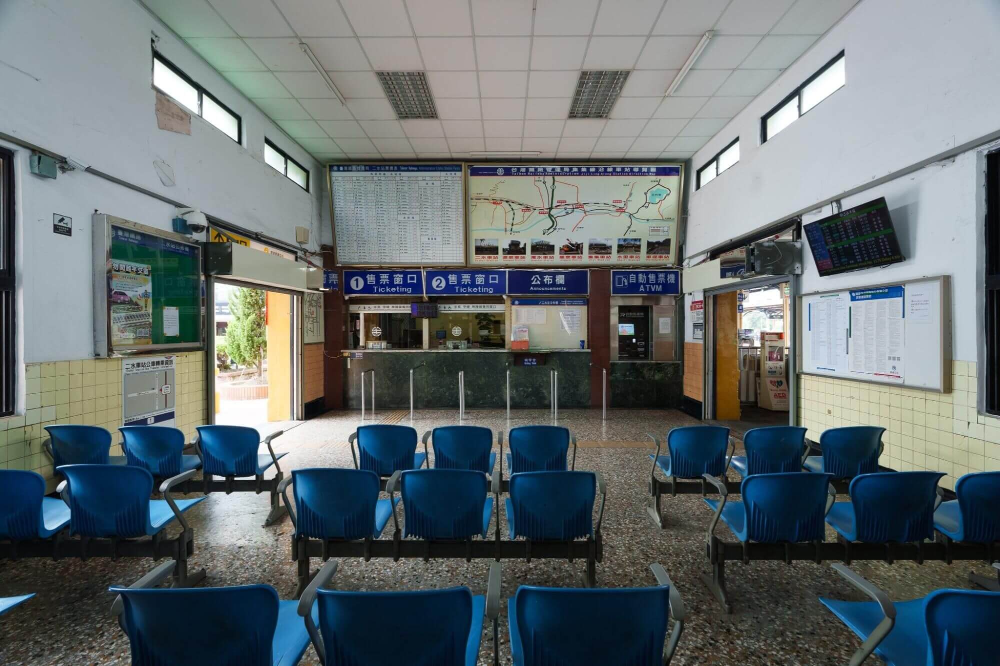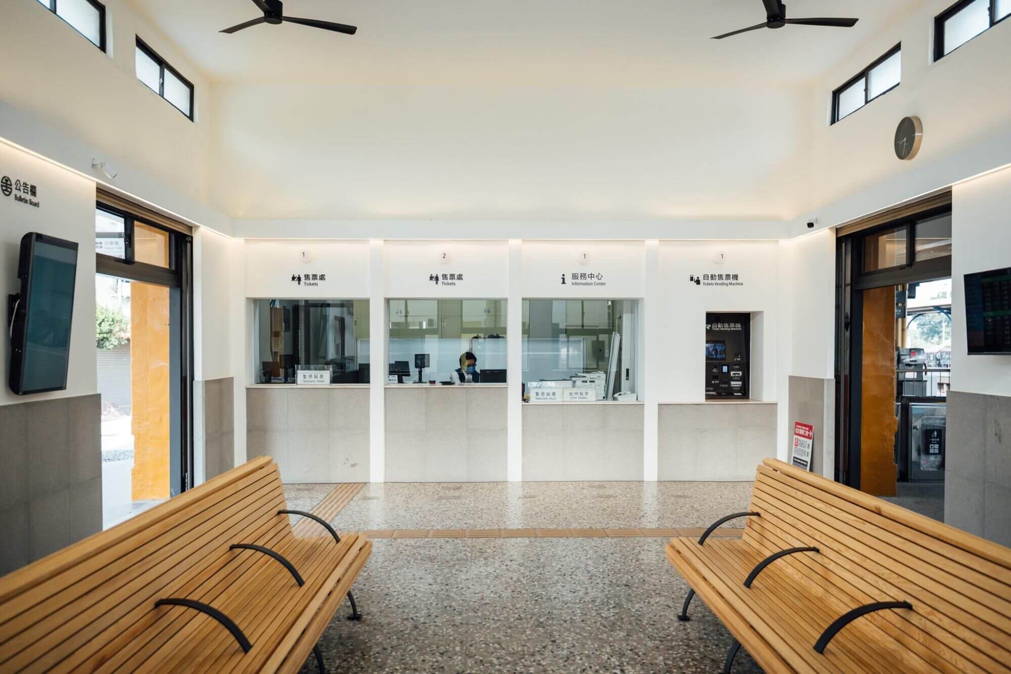 除了外觀整理,改造也從旅客的使用體驗出發。車站入口處移除了阻擋視線的 ATM 與花圃,使入口更加開闊,也讓輪椅與自行車通行更順暢。走進候車室,整體空間採用 低飽和灰白色調,搭配磨石子地面與復古鋼條木板椅,讓空間多了一種沉靜的質感。那種不刻意裝飾的氣氛,反而讓人更容易停下腳步。
