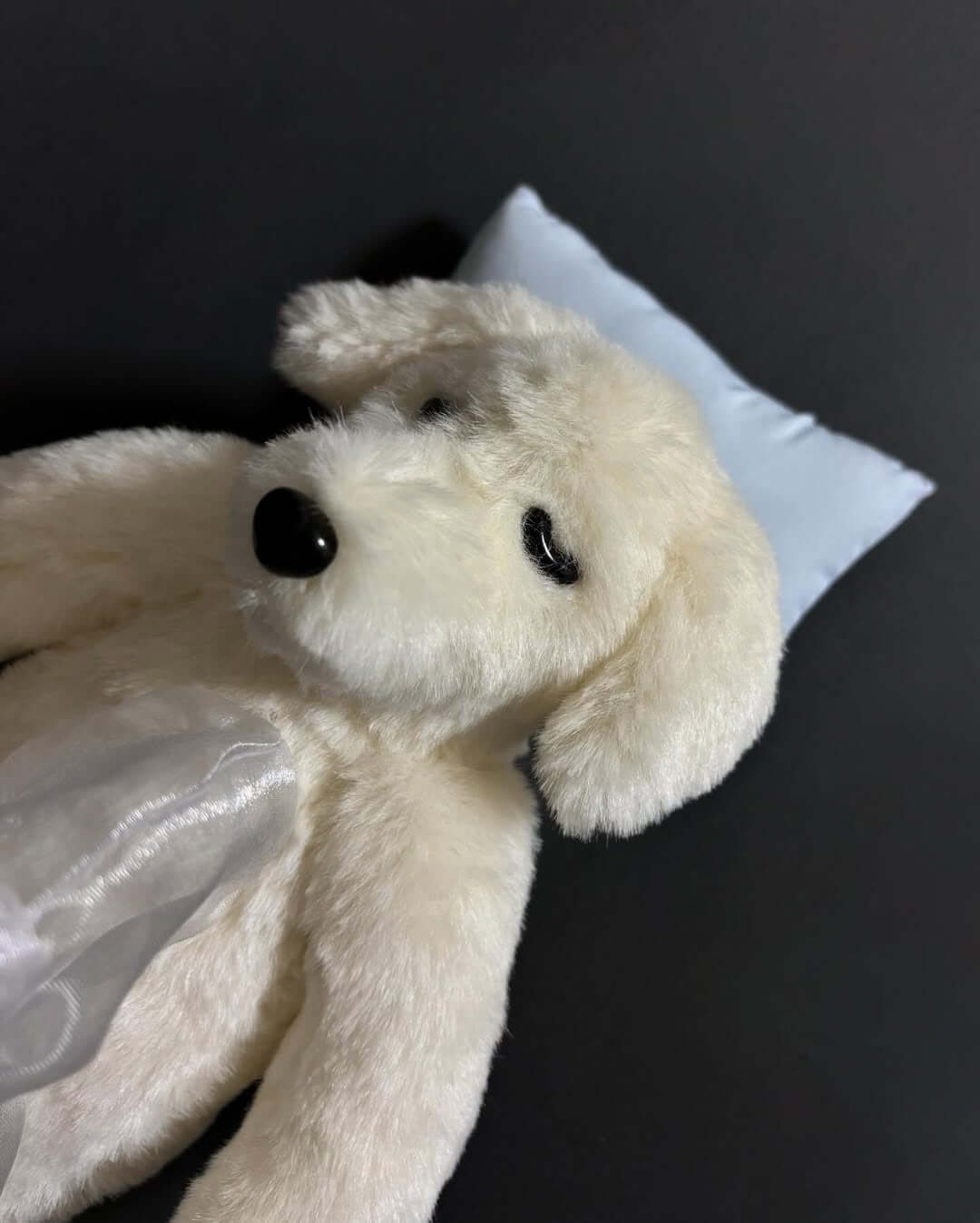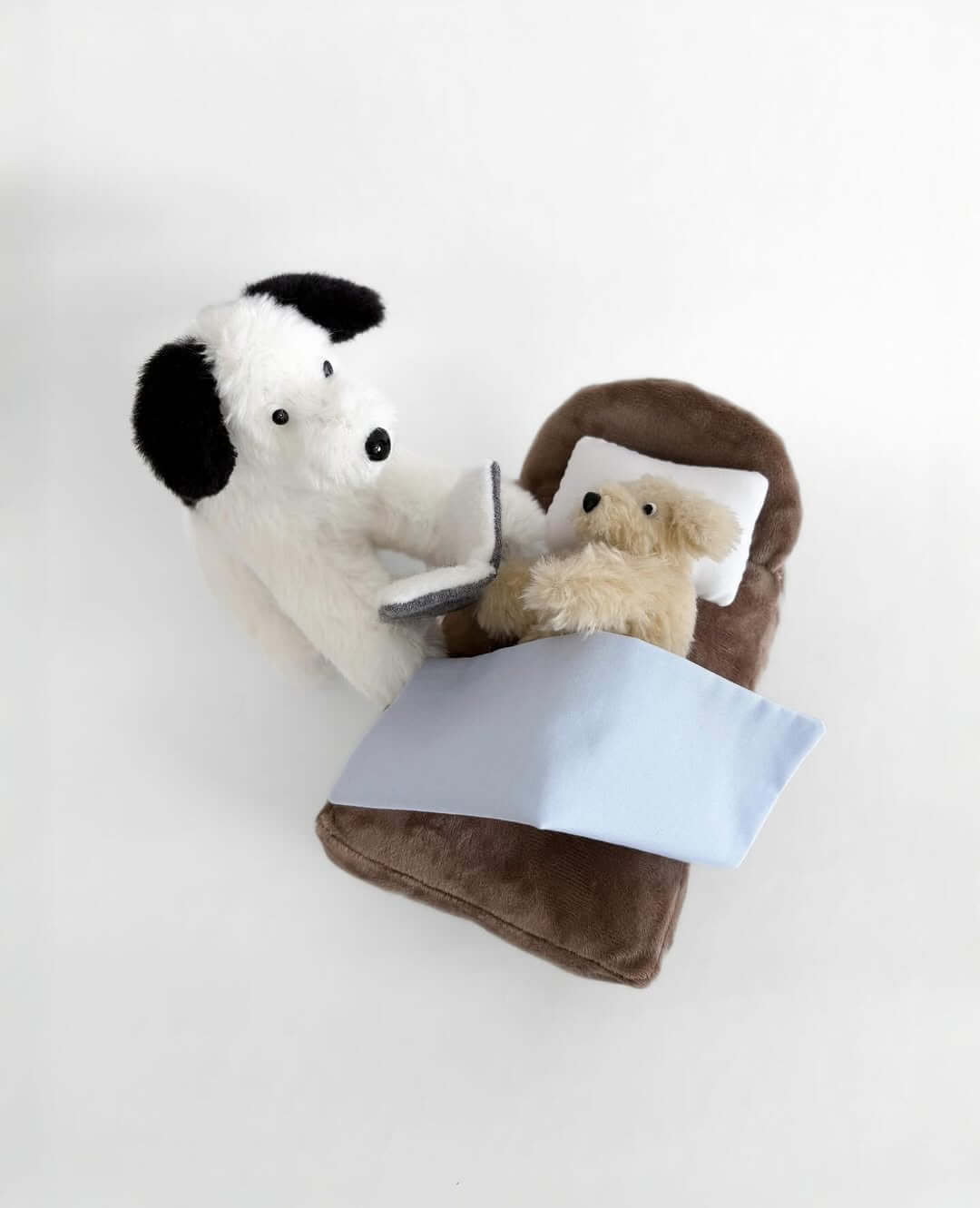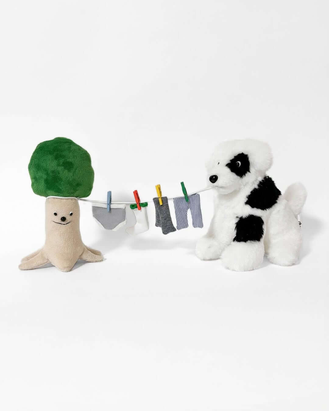 wani souma 的玩偶之所以讓人喜歡,並不只是造型討喜。更迷人的,是它們身上總有一種介於日常與幻想之間的氣質。那些角色看起來像我們熟悉的小狗、小動物、小物件,卻總會多出一點奇怪又合理的情節。像是一顆椰菜和斑點狗一起曬衣服,像是一隻愛挖洞的小狗,最後居然和地鼠成了朋友;也有小狗聽著媽媽講床邊故事,聽到一半直接睡著,或是背著一隻小雞到處散步。
