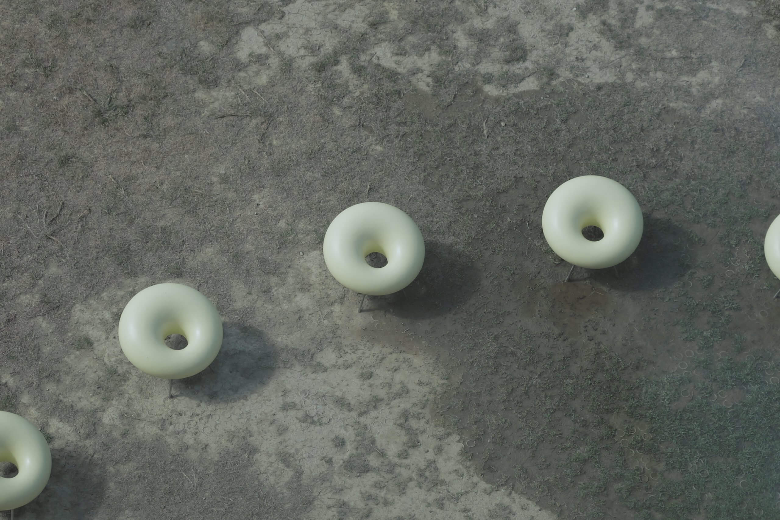 飽滿的圓形開口、鵝黃色的溫暖色調,讓它在大片綠意之間既輕快又安穩。比起傳統的公園家具,它更像是一件裝置藝術——可以坐,也可以只是靜靜存在於景色裡。