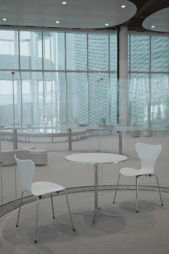 這張椅子幾乎是一首短詩。名為「水滴椅」,造型就像捕捉了水滴下墜的那剎那:圓形盤面、鏡面金屬材質、細短的椅腳,使光線在建築間游移折射,彷彿讓空氣也隨之跳動。它不只出現在綠美圖,也能在金澤 21 世紀美術館、瀨戶內藝術祭找到身影,是 SANAA 作品常見、卻永遠不膩的經典家具。