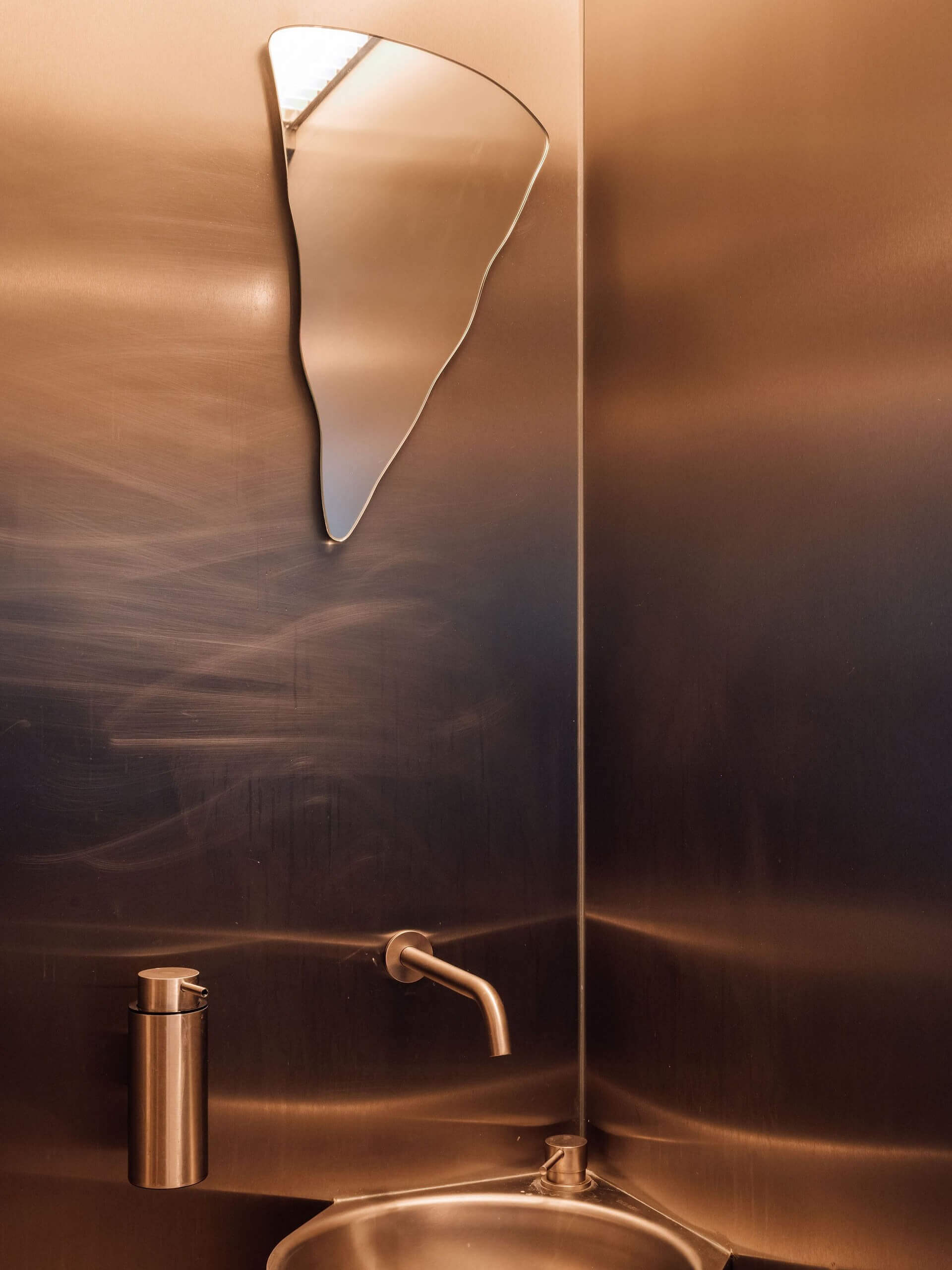 XXXI.studio 認為,「披薩製作」本身就是品牌最強的招牌,因此乾脆消除內外的界線,讓店鋪像城市的一部分,讓路人也能自然地與餐廳互動。鋼材反射著街上的光線,行人經過、汽車掠影、夕陽折射,都被鏡面包覆的室內帶進空間裡。城市的流動不再在外面,而成了室內氛圍的一部分。