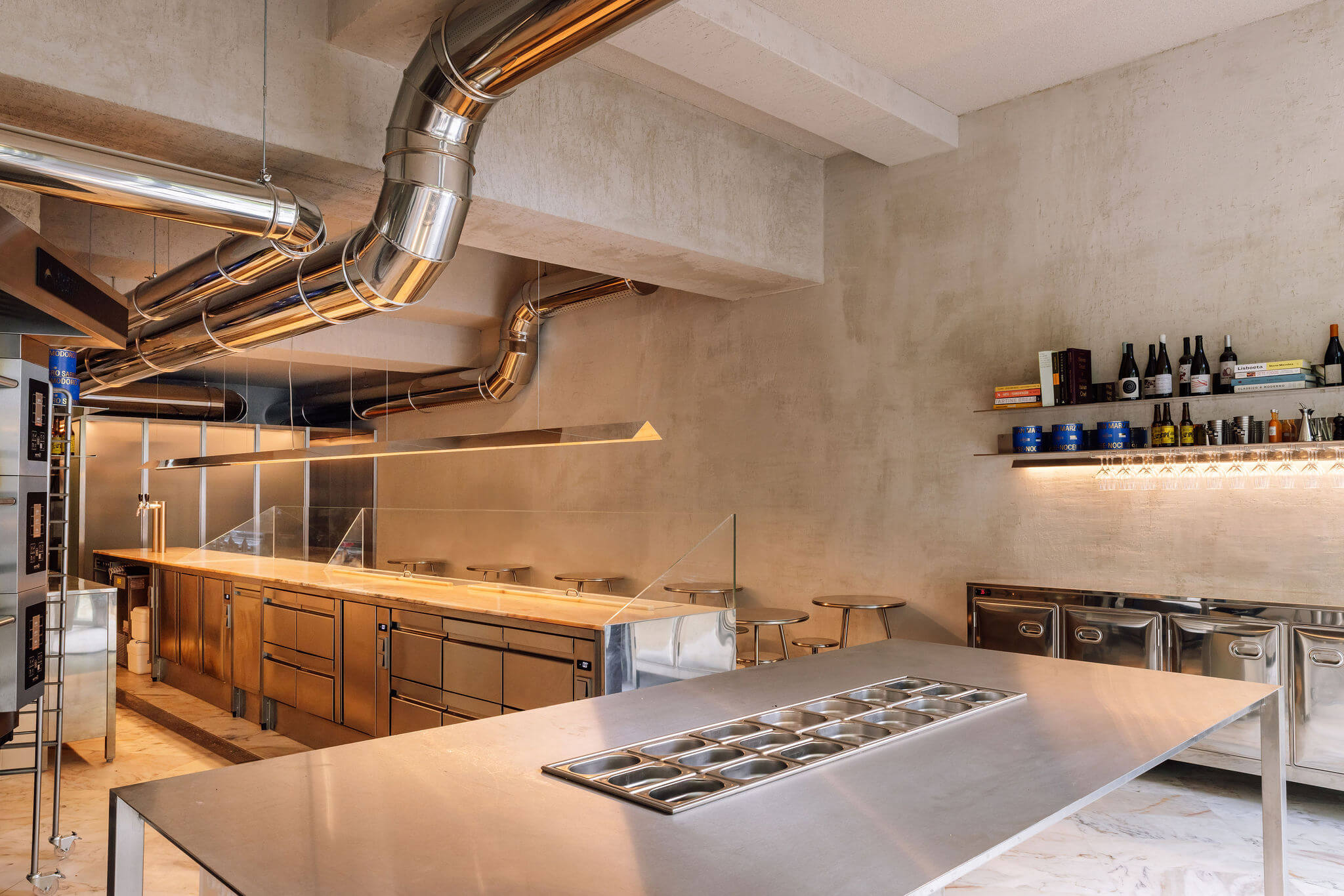 輕盈、反射感強烈的金屬線條,讓空間乾淨、直接,與披薩製作的節奏同步。