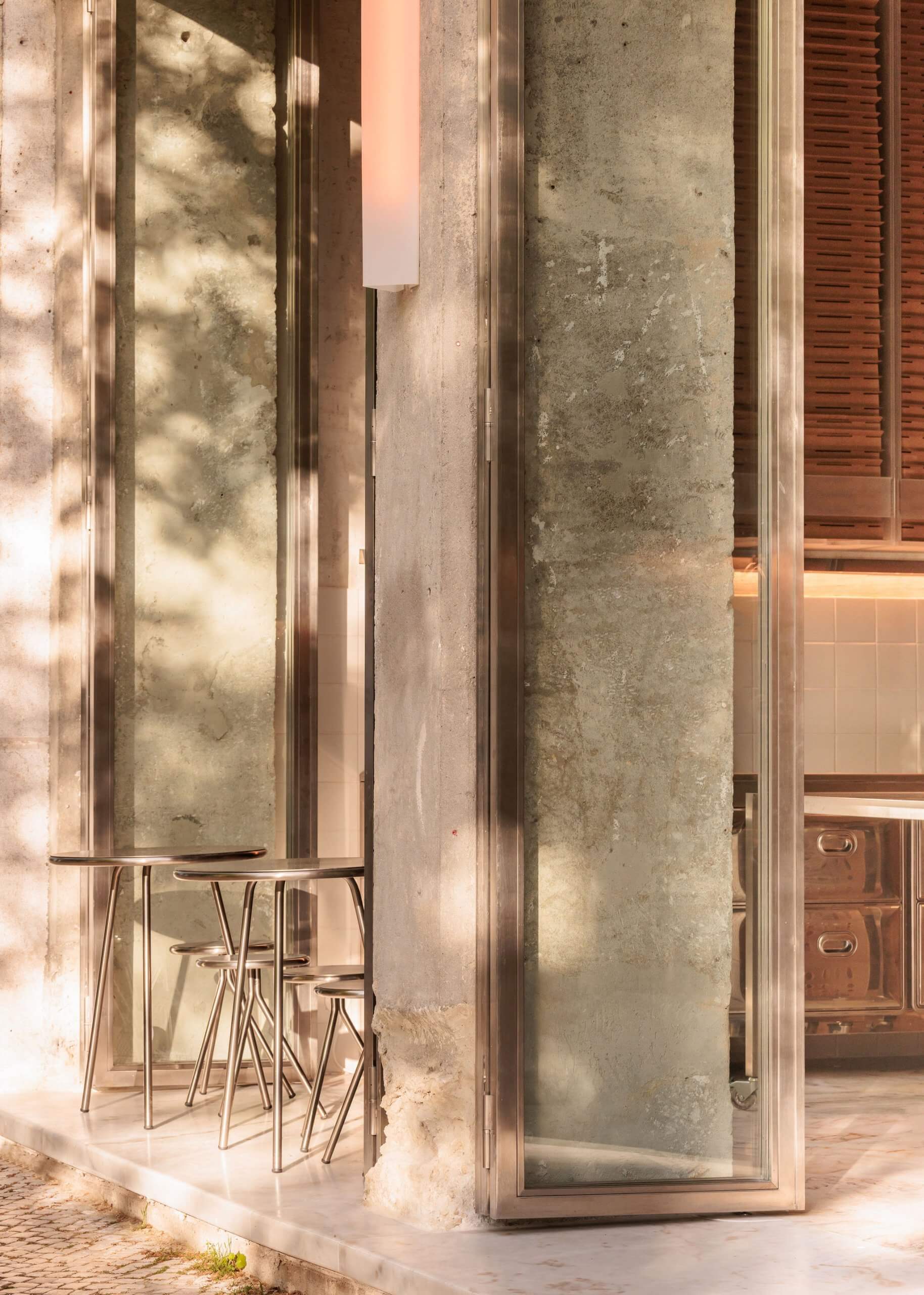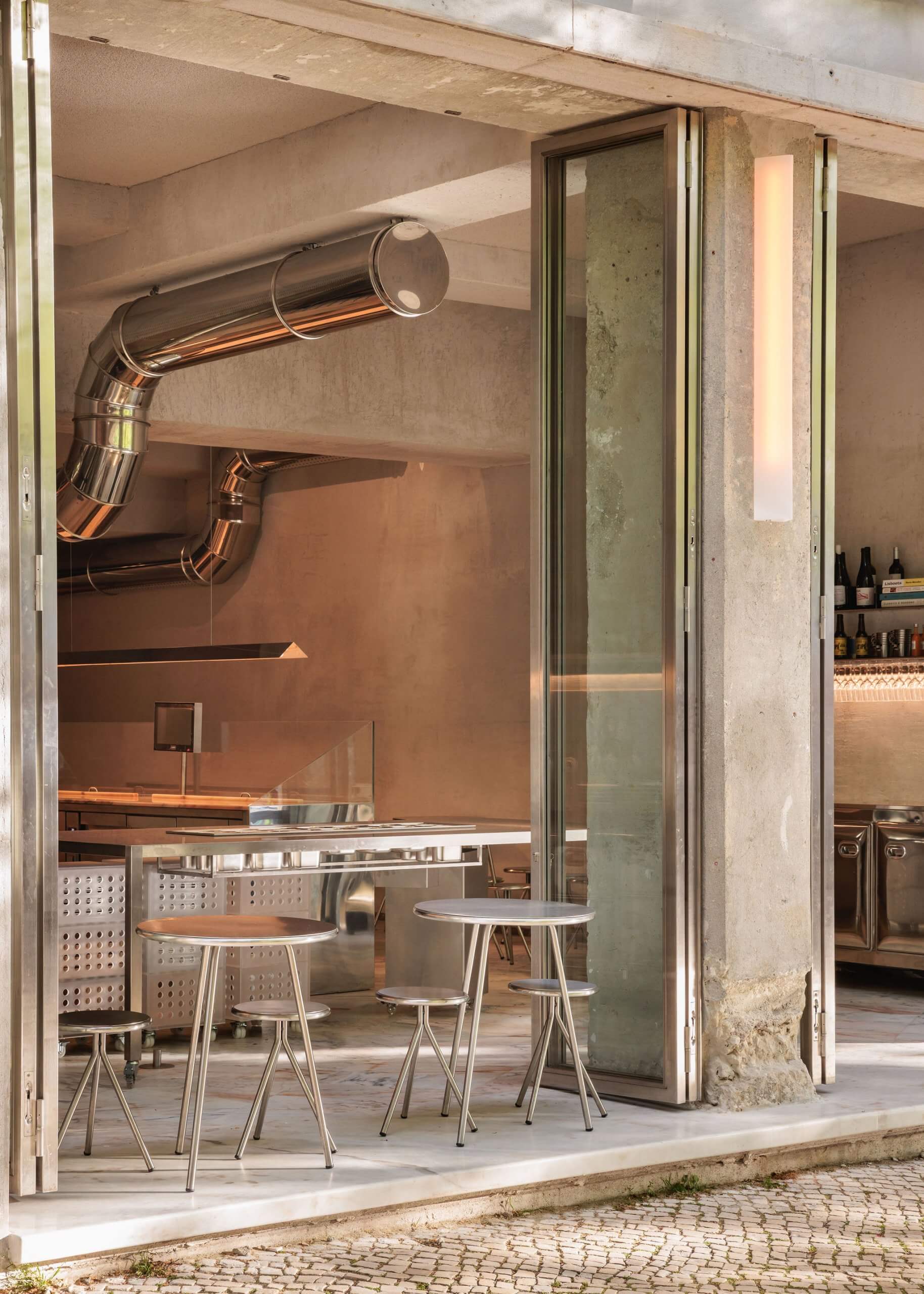 走在 Alvalade 的街道上,很難不被 Lupita 吸引。店面沒有傳統招牌,也沒有遮蔽物,藉由巨大的折疊窗系統(bi-folding window)將立面完全收攏,整間店像被「抽掉」了邊界,留下的是一個直接向人行道敞開的空間。製作披薩的過程因而成為最醒目的視覺語言——揉麵、鋪料、入爐,全都在街景的前景展演。