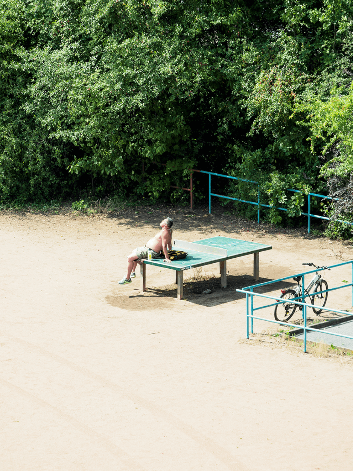 《TTP》系列的迷人之處,在於它的高度重複性。同一個視角、同一個構圖、同一張乒乓球桌,但每一張照片都不一樣。人們的姿態、距離、天氣、光線,甚至乒乓球桌是否「被使用」,都在微小差異中形成節奏。乒乓球桌不再只是運動器材,而成為一個測量城市生活的尺度:誰會停下來?誰會繞過?誰會佔據它?