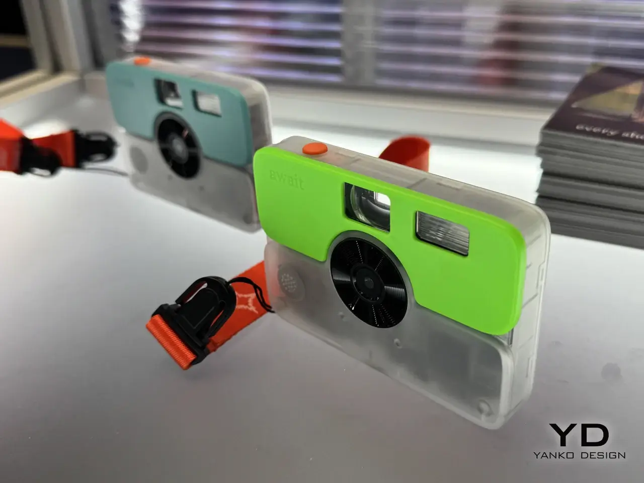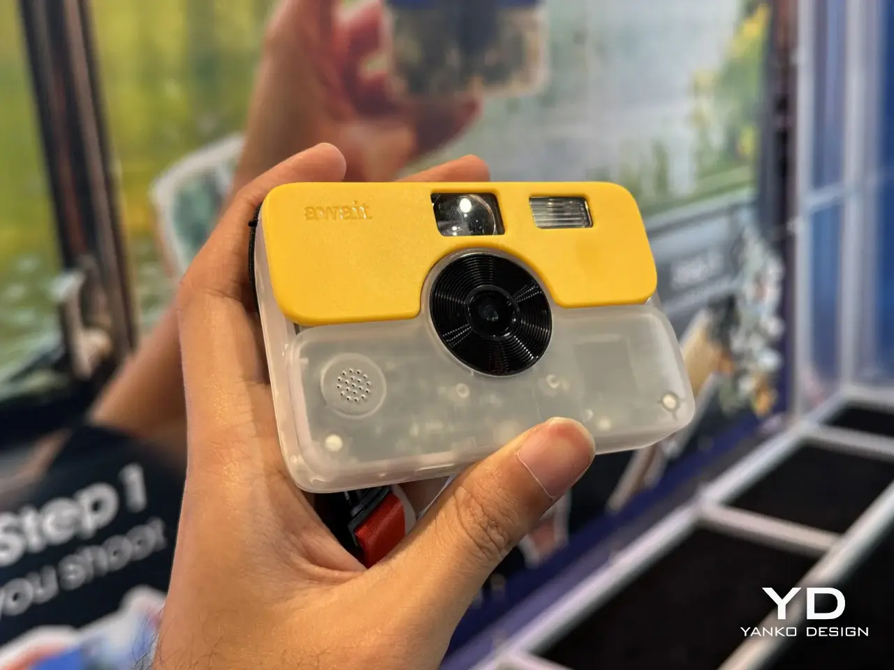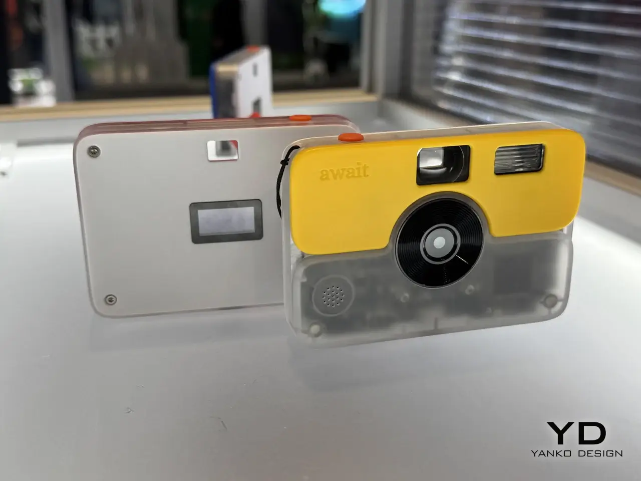Await Camera 的外型,明顯向一次性底片相機致敬,但細節卻很講究。半透明的下半部機身,能直接看到內部結構,帶著濃濃 Y2K 風格;上蓋則可更換,亮黃、萊姆綠、湖水藍、鈷藍色,全都是高飽和到近乎張揚的配色。機身尺寸僅 98 × 67.5 × 15.5 mm,重量 95 公克,可以輕鬆放入口袋。操作介面也被壓縮到極限: