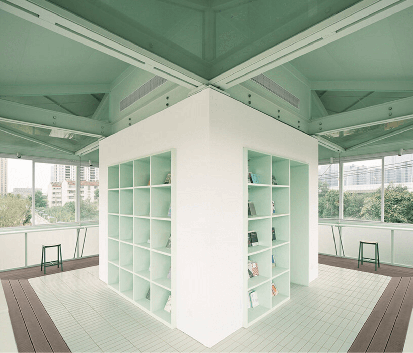 上層四面環繞書架,閱讀桌嵌入主鋼構之中。滑動窗可開啟,讓視線重新指向城市與樹梢。原樓梯被強化並封閉為服務豎井,外牆成為留言牆。訪客在此留下手寫字條與圖畫,慢慢取代過去屬於紀律與命令的符號。南北兩側增設戶外平台,提供咖啡與小型活動空間,使書店向公園延伸。建築曾為監視點,如今成為共享視角。