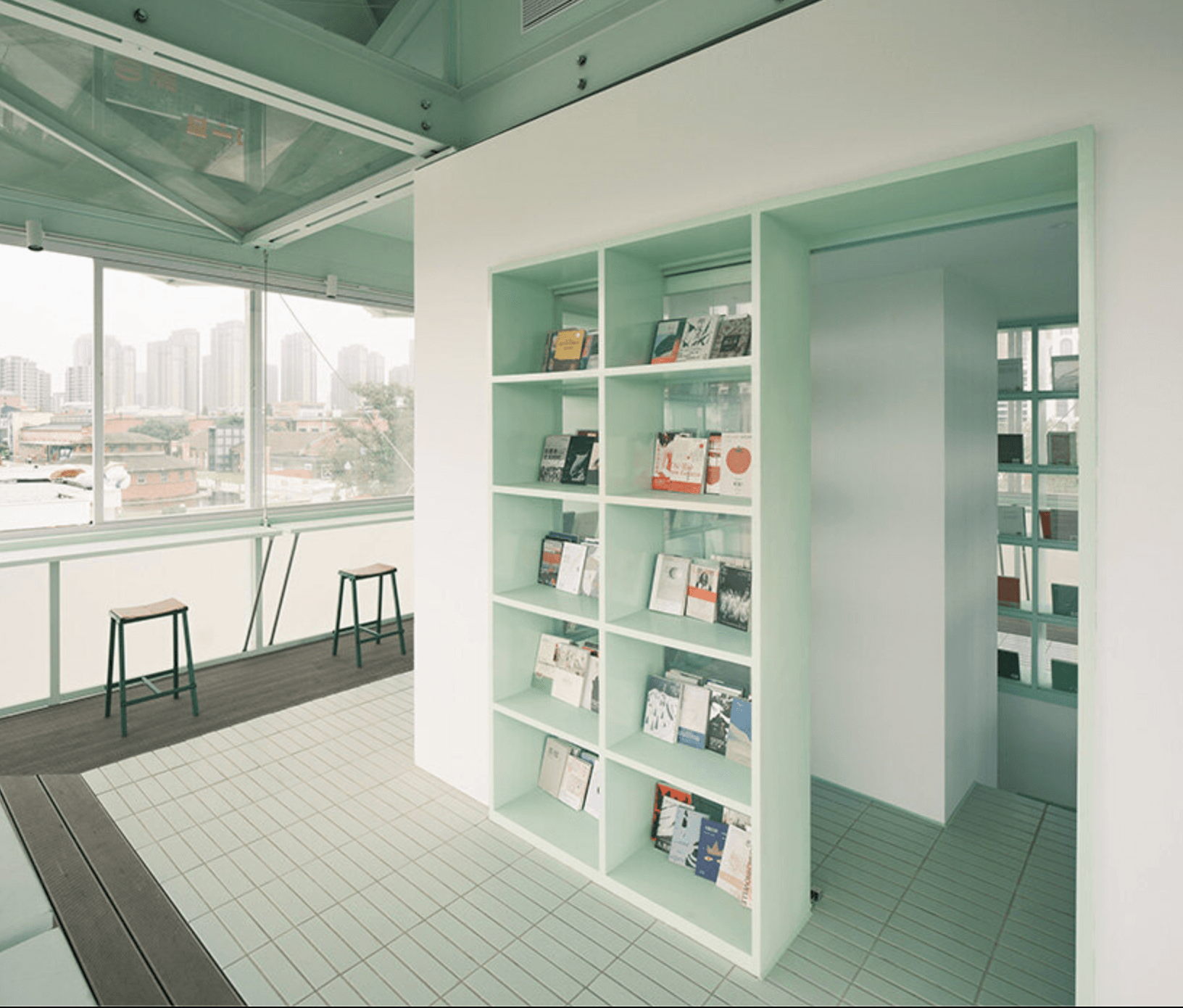 這座塔樓的地面層面積僅 7 平方公尺,尺度逼仄。二樓原本是巡邏平台,視野開闊,可俯瞰園區與街道。原有窗框與鐵柵欄仍清晰可辨——那曾經是機槍架與觀察孔的位置。建築語彙沒有被抹除,而是被保留。新的功能,是一間全天候開放的小書店。過去的節奏屬於監控與秩序,如今換成閱讀與停留。