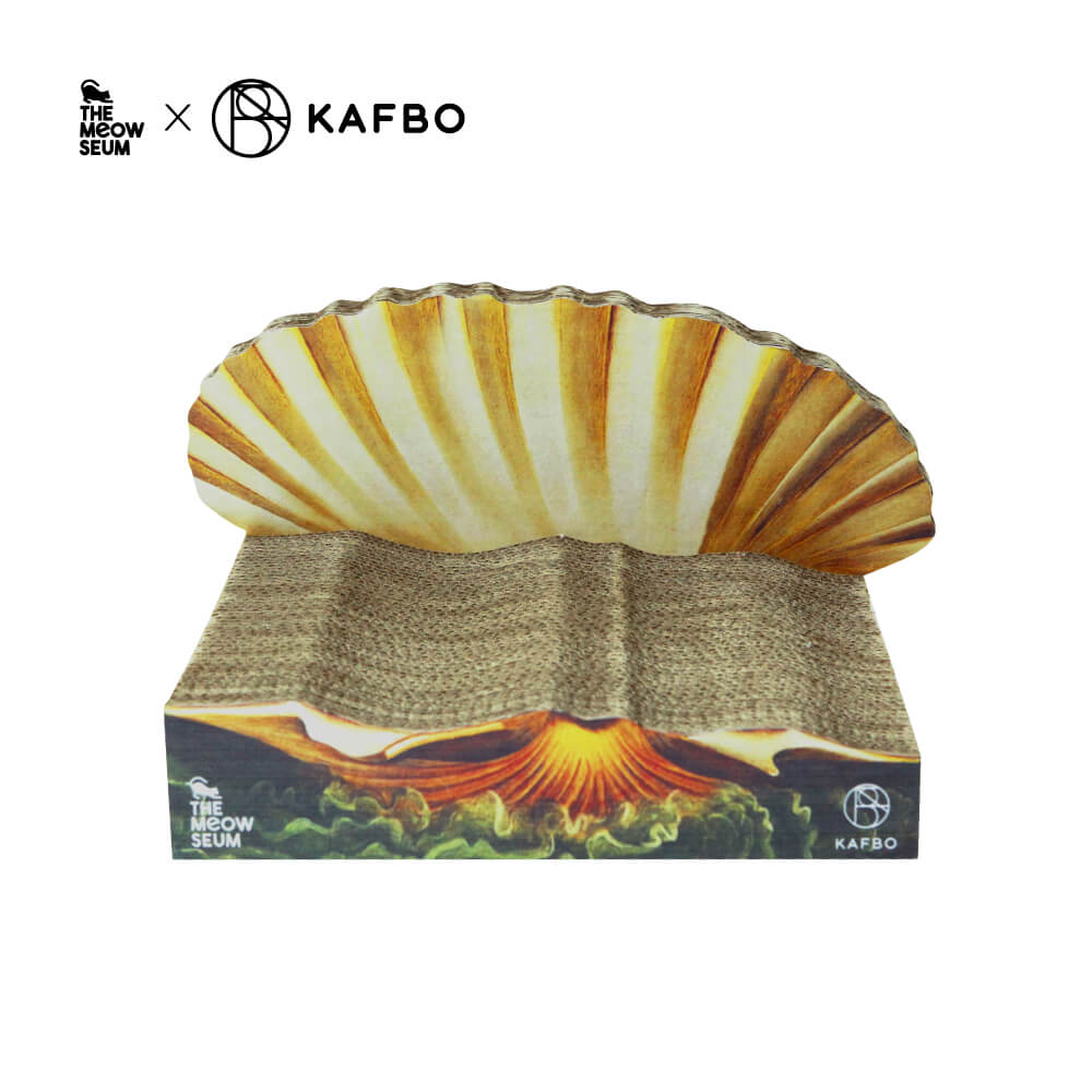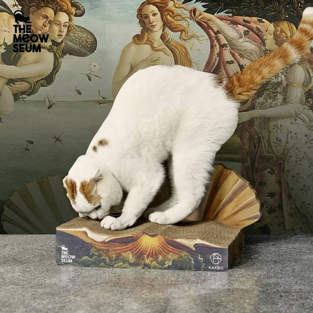 除了《蒙娜麗莎》,聯名系列另一件讓人會心一笑的作品,是以波提切利名畫《維納斯的誕生》為靈感打造的 Cat Scratcher Venus。這款設計把女神誕生的貝殼化作貓抓板底座,並以層層切面的方式模擬海浪,整體尺寸相對小巧,卻很有雕塑感。它不像一般貓抓板那樣直接、日常,而是多了一點場景式的趣味,像是替貓咪準備了一座微型舞台。