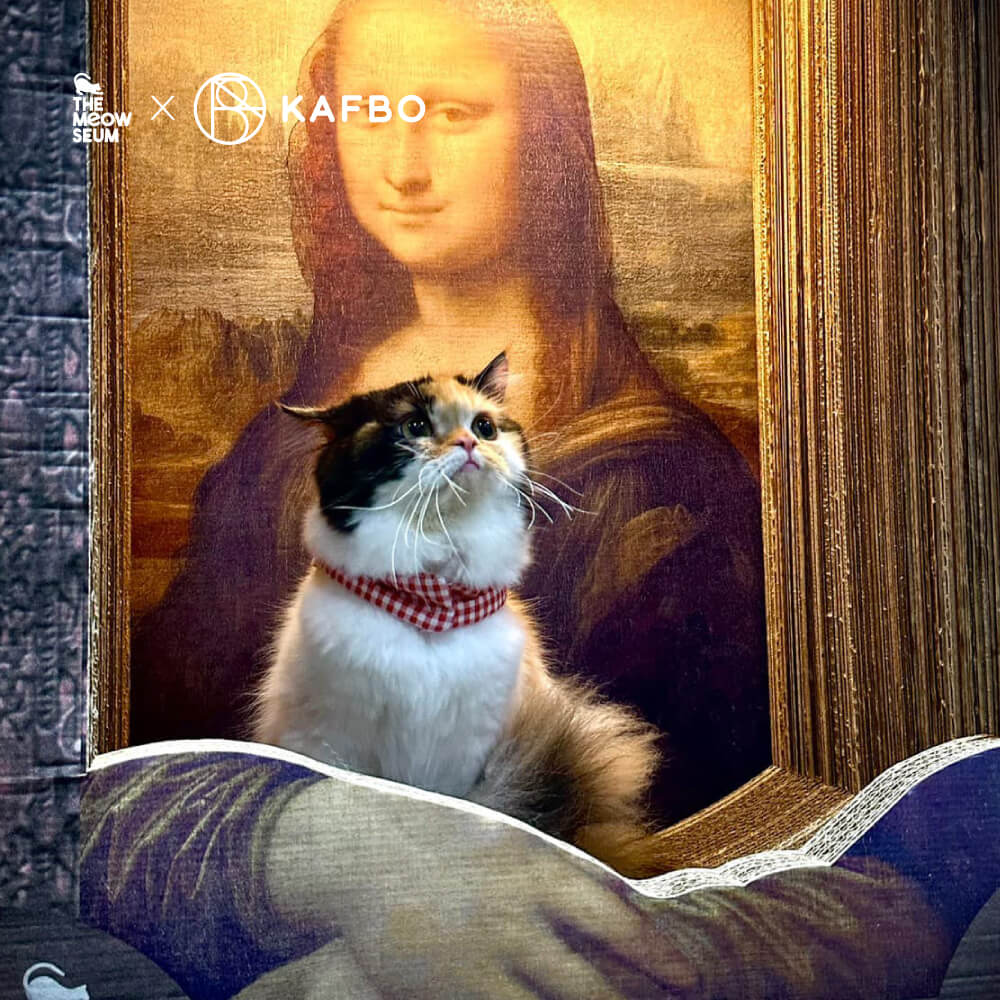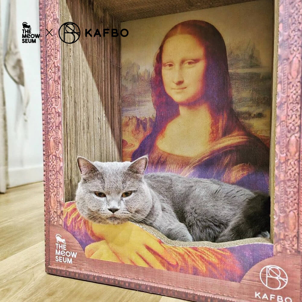 這次聯名裡最受矚目的,是一款名為 Cat Scratcher Monalisa 的貓抓板。設計直接從《蒙娜麗莎》出發,把畫框與底座做成抓板結構,中央則留出空間讓貓咪窩進去。當貓一坐好,整個畫面瞬間成立——原來蒙娜麗莎不是在微笑,而是在抱貓。