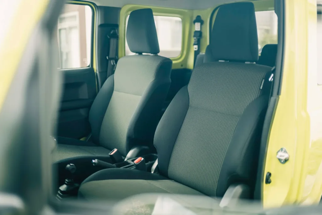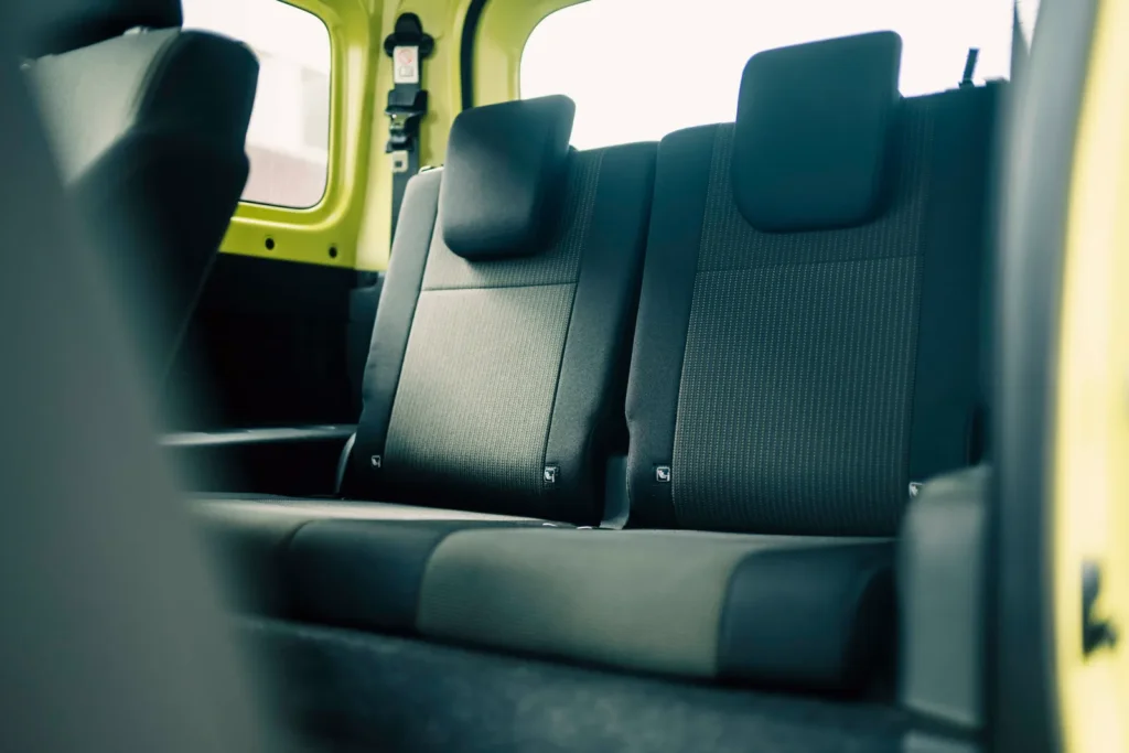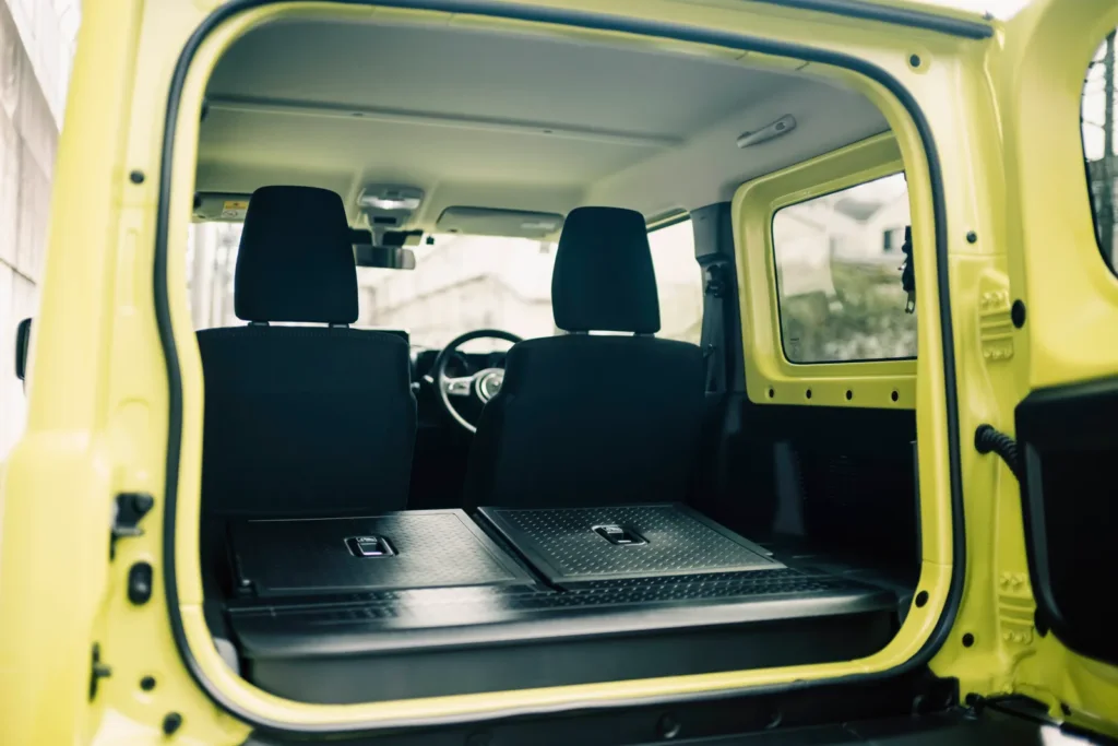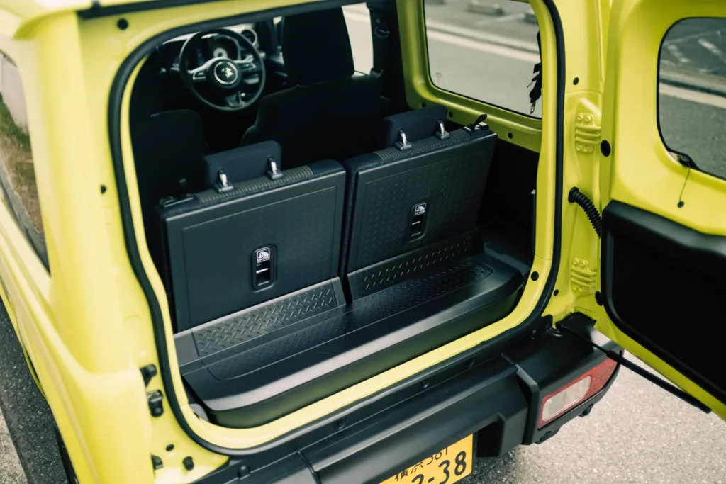 Jimny 向來不是靠寬敞取勝,不過它在空間配置上很知道自己該服務誰。前座是防潑水布料,後座可 50:50 分離傾倒,頭枕可以收折或拆除,行李廂地板則採防污材質。這些細節加起來,會讓人很明確地感受到:這台車考慮的是泥土、裝備、露營用品、釣具、雪板,不是精品袋。