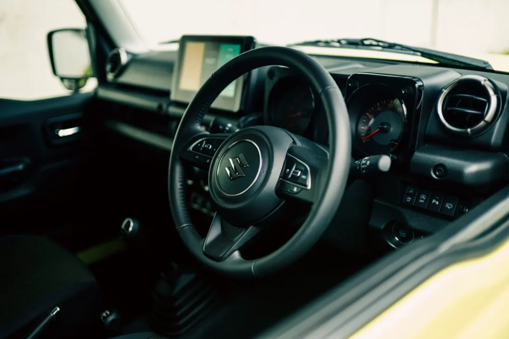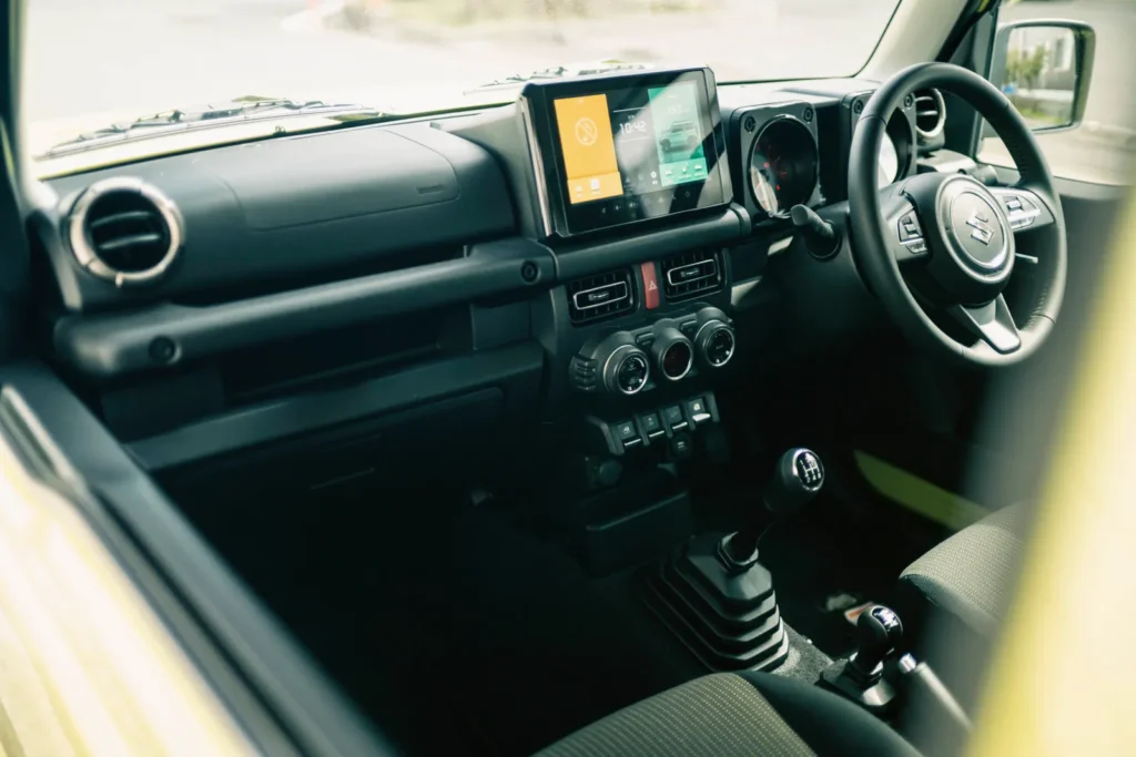 坐進車內,第一印象還是 Jimny 熟悉的那種氣質。線條簡單,視覺帶點工具感,沒有刻意包裝得太精緻,反而讓人比較放鬆。這種設計放在現在的車艙裡,其實很少見。但這次改款也把該補的東西補上了。
